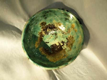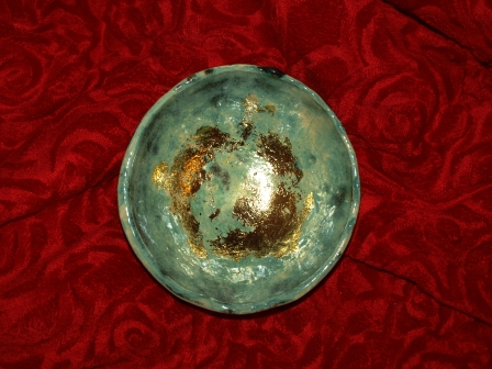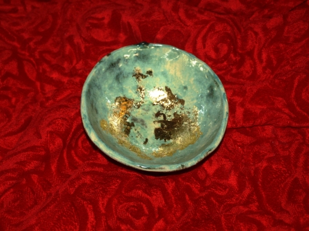 Ich habe versucht Blattgold gleich bei Brennen mit in die Glasur zu bringen. Das funktioniert nicht. Das Blattgold ist beim Schürbrand mit verbrannt.