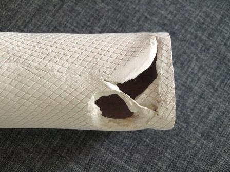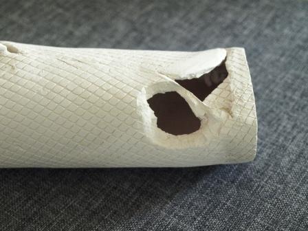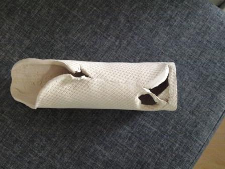 Vase mit Hintergrund, leider zu wenig getrocknet, so daß der dickste Teil beim Brennen weggesprengt wurde. Schade. Ungeduld.
